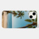 Praia tropical com ondas de turquesa e palmeiras solares. Perfeito para capas de telefone de verão vivas.