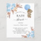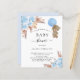 Para um chá de fraldas moderno estilo boho. Fundo branco. Decorado com flores azuis-claras, rosas, grama-pampas e um ursinho-peluche segurando um balão azul. Personalize e adicione um nome e detalhes da parte.