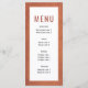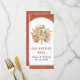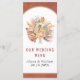Folhas de palma secas tropicais, erva de pampas e flores de protea, cartão de cardápio botânico do arco de terracotta. Esta adorável design de casamento apresenta um quadro de arco em terracotta. No quadro há um buquê de palmeiras secas, flores de proteína e gramíneas-pampas.