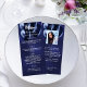 Personalize e adicione um nome, idade e menu. Um fundo azul marinho. A cor azul é irregular. Letras brancas coloridas. Decorado com balões azuis. Traseiro: adicione uma foto e fatos/bio divertidos sobre a aniversariante. Remova os nomes se não for necessário.