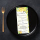 Um cardápio de casamento para um casamento no verão. Abelhas bonitas, florais amarelos e mel pingando de favos. Personalize e adicione seus nomes, data e menu de casamento. A palavra Menu é escrita com um script de estilo alfanumérico com letra de tendência com alternâncias.