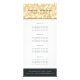 O design de placa de rack preto e ouro elegante mostra seus serviços, sua lista de preços ou informações comerciais de forma excelente. O design apresenta uma borda de luzes do chanpanzé de ouro no topo, com seu nome e/ou nome comercial sobrepostos. Inclui quatro cabeçalhos personalizáveis e campos de texto corporal, e espaço para as informações de contato da sua empresa na parte inferior, com carvão fora do preto. Para ajustar o layout, digite seu texto e use a função Personalizar para alterar o posicionamento e os tamanhos de fonte.