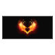 Coração de anjo com asas flamejantes em fundo preto.