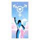 Silhuetas femininas estão sob um céu de algodão doce com um símbolo transgênero branco no céu como o sinal de morcego, ele tem um coração no meio.