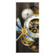 Marcações antigas com engrenagens de ouro e latão, decoradas com libélula mecânica sobre fundo castanho e listrado. Steampunk.