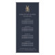 O design de placa de rack elegante mostra seus serviços de penteados ou a lista de preços do salão de forma elegante. Design apresenta uma inscrição branca clássica sobre um fundo azul marinho adornado com um par de tesouras talhadas floralmente em folha de ouro falsa. Inclui quatro títulos personalizáveis e campos de texto do corpo, e espaço para as informações de contato da sua empresa na parte inferior. Para ajustar o layout, digite seu texto e use a função Personalizar para alterar o posicionamento e os tamanhos de fonte.