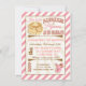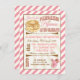 Convites de festas de aniversários Pancakes e Pijamas super fofos e modernos com uma pilha enorme de panquecas jovens com manteiga e xarope em um fundo de explosão solar. Acentos cor-de-rosa e pantufas de coelho felpudo. Ilustração desenhada à mão por McBooboo.