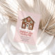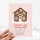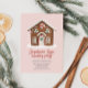 Este convite cor-de-rosa festivo apresenta uma grande casa de pão de gengibre de aquarela, decorada com gelo branco e hortelã-pimenta verde e vermelha, com flores de neve ao redor da casa. Na parte traseira da placa você encontrará um padrão de listras cor-de-água rosa e vermelha. O cartão também apresenta tipografia de vintage para os detalhes do partido e um roteiro caprichoso para o título do evento em vermelho.
