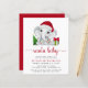 Férias de Natal bonitas e amigáveis, feliz convite para o chá de um bebê bebê com "Papais noeis Bebê" em um roteiro na moda vermelho com baloiços, uma aquarela de um bebê elefante vestindo um chapéu de Papai Noel com uma árvore de Natal, uma bengala vermelha e verde e presentes, o nome da futura mãe na elegante tipografia vermelha e os detalhes do chá em uma simples tipografia moderna.