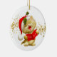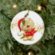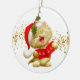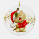 Enfeites de natal mostrado em forma redonda com fundo branco e um fundo vermelho colorido com um gatinho de papais noeis de feriado bonito. Personalize este item ou comprar como está.