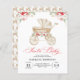 Este convite para o chá de fraldas apresenta uma carruagem de bebês inspirada em vintage, enfeitada com verde festivo e flores vermelhas, criando uma sensação de feriado acolhedora. A frase "Papais noeis Bebê" é escrita em um encantador roteiro vermelho no topo, definindo um tom alegre. Perfeito para uma comemoração de dezembro, este design combina calor e sofisticação lindamente