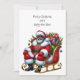 Ilustração digital de Papais noeis pretos sentados numa trama com um cheio de presentes. O texto pode ser personalizado ou removido, incluindo mensagem e endereço da sua empresa no verso. Imagem assistida por IA adquirida com uso comercial. Trabalho de arte: DreamCafeArt