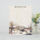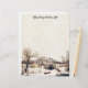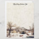 A pintura maravilhosa das belas artes do vintage de um cavaleiro do cavalo e do trenó que passa uma cena do país com casas da quinta e uma lagoa em um dia de inverno nevado, por Durrie, está neste papel de letra do Natal da família. A imagem é dominio público devido aos direitos reservados expirados.