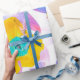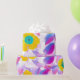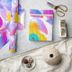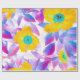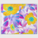 Um design floral vibrante com flores amarelas ousadas com centros turquesa, rodeadas por pétalas rosa, roxas e azuis em um fundo branco crocante. Perfeito para papel de embrulho, suprimentos para festas ou decoração alegre para o lar.