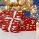 Papel de embrulho de Natal com ilustração de uma menina feliz sorridente e de cabelo comprido, ela está vestindo fantasia vermelha e branca de Papai Noel e segurando um presente; design de Natal com fundo vermelho sem soldadura com estrelas