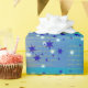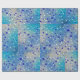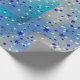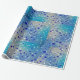 Papel de embrulho de Natal coberto por estrelas azuis, flocos de neve brancos e o anúncio escritural do nascimento do Cristo em letra de ouro. Tudo em um fundo azul multitonado.