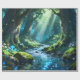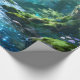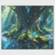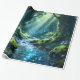 Lindo papel de embrulho de floresta encantada com uma cena sonhadora de bosque com água brilhante, raios de sol, árvores musgosas e uma atmosfera mágica de fantasia. Perfeito para aniversários, presentes especiais, amantes da natureza, fãs de fantasia e embrulho de presente elegante.