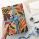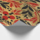 Hohloma russo papel de embalagem, arte russa, morangos vermelhos, folhas amarelas, fundo preto