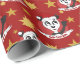 Papel de embrulho de Natal design personalizado com ilustração de um cabeça de panda fofo com chapéu de Papai noel, em círculo vermelho, com estrelas amarelas, design de Natal para crianças, com modelo de texto personalizável para o seu nome ou mensagem; ilustrado por Radka Kavalcova