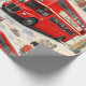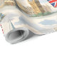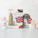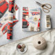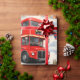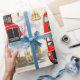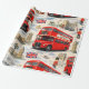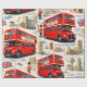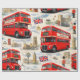 Envolva seus presentes no charme atemporal da capital britânica com este papel de embrulho premium vintage de Londres; esta colagem lindamente detalhada apresenta os símbolos mais icônicos de Londres, incluindo o clássico ônibus vermelho de dois andares Roma, o majestoso Big Ben, as Casas do Parlamento e a guarda real estoica em um chapéu de pele de bar tradicional acentuado com a bandeira da Union Jack e táxis pretos clássicos contra um fundo suave e nublado