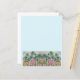 Pequenas cabanas tropicais são apresentadas entre palmeiras de altura múltipla, criadas em aquarela e em meios mistos.