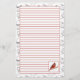 Papel de papelaria revestido de bonito guarnição, decorado com um pássaro cardeal vermelho pintado em aquarela com uma borda de caneta preta e folhas e caules de tinta. Bom para naturalistas e observadores de pássaros!
