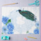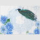 Este lindo pavão é combinado com dahlias azuis, ornamentos antigos e notas de música esmaecidas.