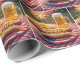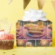 Um cachorro-quente com a palavra "América" na mostarda se senta em uma placa de bandeira patriótica, acompanhada de batatas fritas e uma caneca de cerveja em uma toalha de mesa vermelha e branca