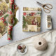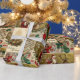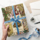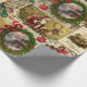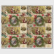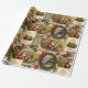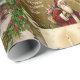 This design features a repeating Christmas pattern that looks like old-fashioned wrapping paper. It displays classic pictures of Santa Claus in his red suit standing next to a reindeer, along with large green holly wreaths tied with red ribbons that circle a snowy winter scene. The design is filled with traditional holiday details like lit candles, scrolls with greetings like "A Happy Christmas Tide," and warm colors that create a cozy and festive feeling.