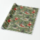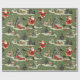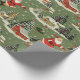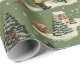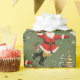 This design uses a soft, sage-green background with a wintry village scene, showcasing repeating images of a running Santa Claus, snow-covered houses, and evergreen trees.