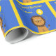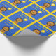 Esse papel de embrulho de leão está pronto para você personalizar adicionando o nome da criança de aniversário. As cores azuis e amarelas brilhantes atraem crianças pequenas, e elas adorarão este leão sorridente com seu balão amarelo de 4° aniversário. A saudação padrão é "Parabéns", mas você também pode mudar isso se quiser. Dica: o design em camadas garante diretrizes fáceis para cortar o papel até o tamanho.