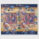"Joy, Peace,Love" design de Natal elegante, clássico, brilhante e alegre em pergaminho com antigas florestas florais florentinas e uma brilhante pedra de safira azul 3D elaborada a partir da miniatura medieval italiana de San Miniato,Toscana