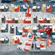 Uma corrida feita à mão na cena de uma aldeia de montanhas de inverno, ao lado das montanhas nórdicas, com raposas vermelhas itinerantes.