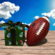 Bolsas de futebol e capacetes de futebol num fundo verde de ferro fundido.