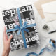 Fontes modernas em tons de cinza, preto e branco. O nome do garoto de aniversário por todo esse papel empolgante. Correspondência de fontes com nome próprio ou palavra escolhida repetida. Papel de presente enfeite qualquer presente de aniversário.