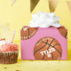 Personalize este design de basquete de aniversário com o nome do seu filho, idade e duas linhas de texto branco em fundo rosa.