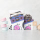 Registros de vinil azuis e cor-de-rosa, caixas de expansão, jogos de vídeo e fitas cassetes de aniversário.