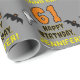 Este design de papel embrulhado no tema de aniversário do Hallowe'en assustador e assustador apresenta um grande número "61". Também apresenta a mensagem "FELIZ ANIVERSÁRIO", além de um nome personalizável. Há também representações de um fantasma e um morcego na frente. Um papel de embrulho como este pode ser usado no empacotamento de presentes que estão sendo dados a alguém que foi nascer no Halloween (31 de outubro) e que está celebrando seu sessenta e primeiro aniversário. [~Z0000411]