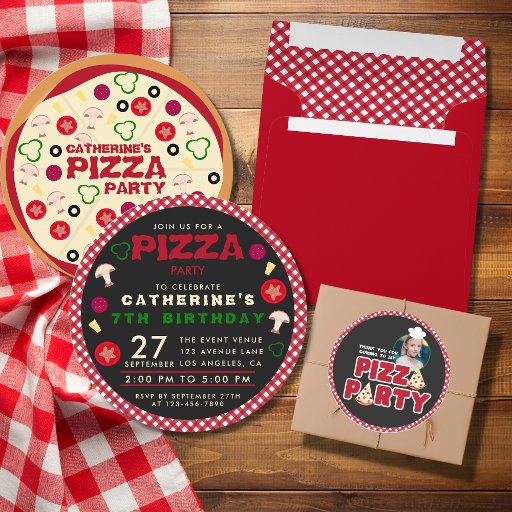 Celebre o aniversário do seu filho num estilo delicioso e divertido com uma festa com tema de pizza! Este artigo de aniversário sobre pizza apresenta uma ilustração colorida de uma pizza com toppings que criam uma atmosfera festiva e convidativa. O fundo foi concebido para se assemelhar a uma toalha de mesa vermelha e branca, que é frequentemente associada a restaurantes de pizza. Além disso, a fotografia personalizada do boné de chef divertida e engraçada torna este design mais divertido e convidativo. No geral, esta design de aniversário de pizza tematizada é uma maneira única e criativa de deixar os convidados entusiasmados com a próxima comemoração.