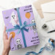 Enrole seus presentes de aniversário em estilo assustador com esse papel de embrulho pastel do Halloween, apresentando esqueletos sorridentes segurando balões, fantasmas amigáveis, morcegos divertidos e estrelas ouros. Colocada contra um fundo de lavanda suave, esta design é perfeita para os aniversários de outubro, festas assustadoras mas doces, ou temas do Dia das Bruxas Pastel. Personalize com o nome de aniversário para um toque especial extra! Pares perfeitamente com o nosso sinal de boas-vindas, obrigado que etiquetas, e embrulhos doces para uma comemoração coordenada.