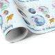 Este papel de embrulho adorável apresenta planetas coloridos com estrelas de folha de ouro falso.