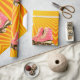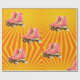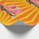 Um papel de empacotamento de presente de aniversário com um grande par de skates de rolo. Os raios solares laranja também aparecem no invólucro de presentes. De uma variedade de papéis de carta pessoais personalizados dos Designs Finos de Chessie.