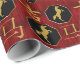 A pintura digital original de Leslie Sigal Javorek neste embrulho brilhante pesado celebra o Ano do Cavalo com a repetição de cavalos ouros em hexágonos negros de borda amarela alternando com ouros chineses para a palavra "Cavalo"+"Boa Sorte" em um fundo vermelho rico. Excelente para capa de fazer também!