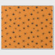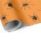 Papel de embrulho assustador do Dia das Bruxas impresso com muitas aranhas rastejantes assustadoras. Padrão de aranha preta sobre fundo laranja. Embalagem de presente de Dia das Bruxas.