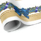 Um padrão repetitivo belo e elegante de faixas de ouro e uma árvore de granizo/decoração de terras recheadas de bagas azuis, folhas verdes e um arco de cobalto FAUX com uma fivela de prata.