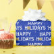 Texto de Feliz Feriado com folha de ouro arco de Natal sobre fundo azul com flocos de neve. A cor de fundo pode ser alterada.