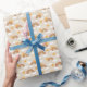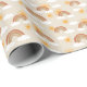 Esse papel de embrulho tem uma dispersão de nuvens de água quente, ouro, sóis, brancas e peludas de água e três listras de terra cotta vermelha, marrom e verde para um padrão boêmico neutro e feliz, perfeito para chás de fraldas ou festas de aniversário neutros em termos de gênero.