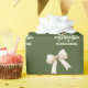 Uma tendência muda o fundo verde-oliva, o texto colorido creme e um arco. Feliz Natal é escrito com uma fonte de estilo retrô. Personalizar e adicionar um nome
