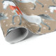 Papel de embrulho de inverno que inclui cavalos brancos pintados a aquarelas com grandes arcos de férias de veludo vermelho sob uma poeira de neve, segundo um padrão repetido num papel de embrulho Kraft a cores.