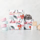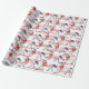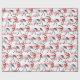 Papel de embrulho de inverno que inclui cavalos brancos pintados a aquarelas com grandes arcos de férias de veludo vermelhos sob uma poeira de neve, segundo um padrão repetido num papel de embrulho de cor branca com um ditado personalizável, "Feliz Natal", em vermelho.d